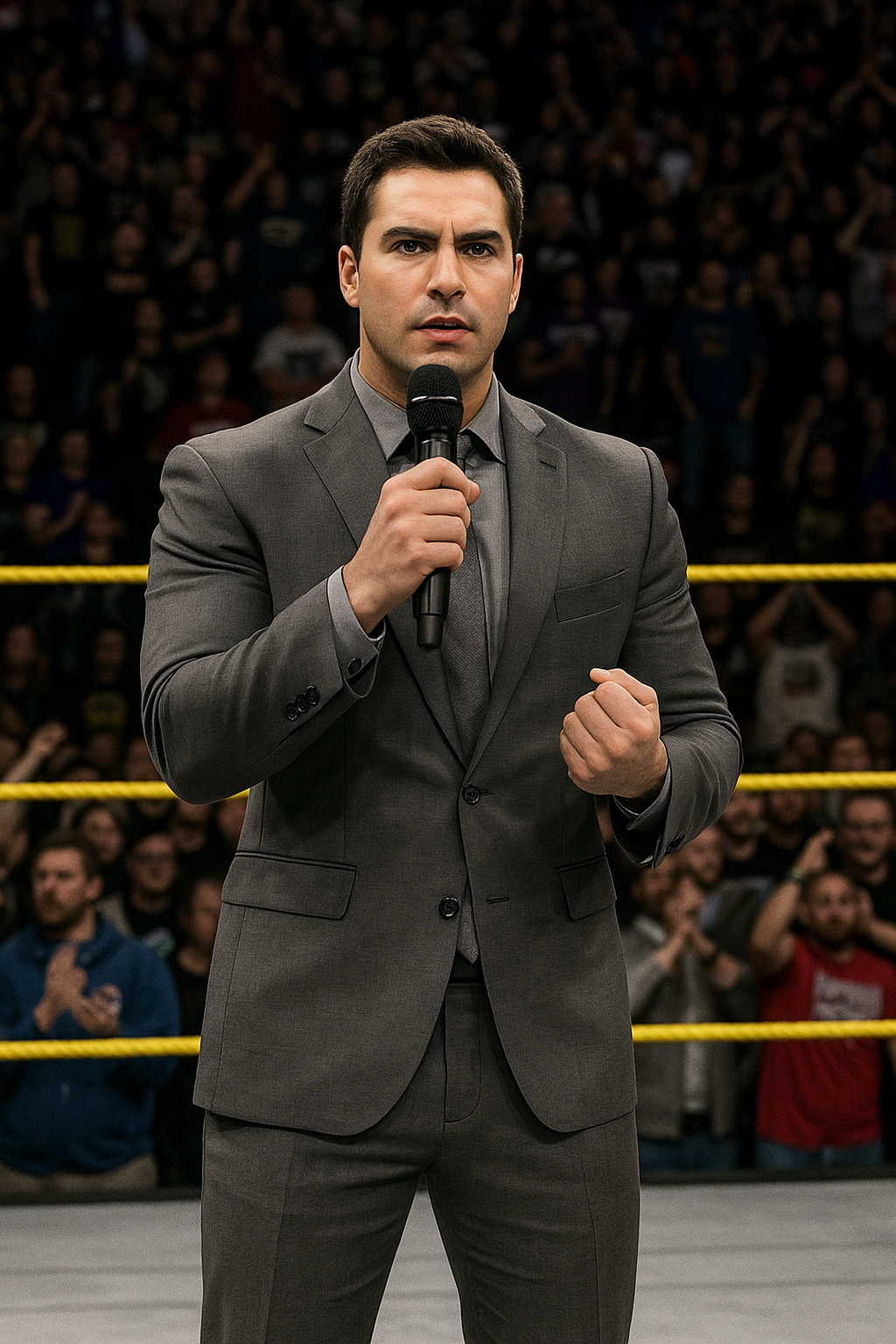 Taking a microphone, Ron makes his way to the center of the ring. The fans continue to cheer. Hall turns around, a smile across his face, taking it all in before pulling the mic in and holding a hand up in hopes that the chants calm down some.