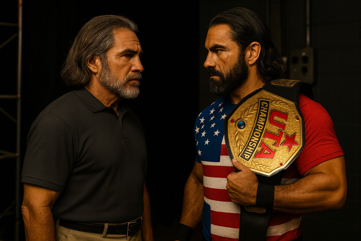The crowd ERUPTS as Hardcore Sandy — the newest UTA Hall of Fame inductee — vaults over the barricade! She’s in street clothes, but her eyes are fire. Standing tall, arms folded, she glares down at Amy like a hunter who’s cornered her prey.