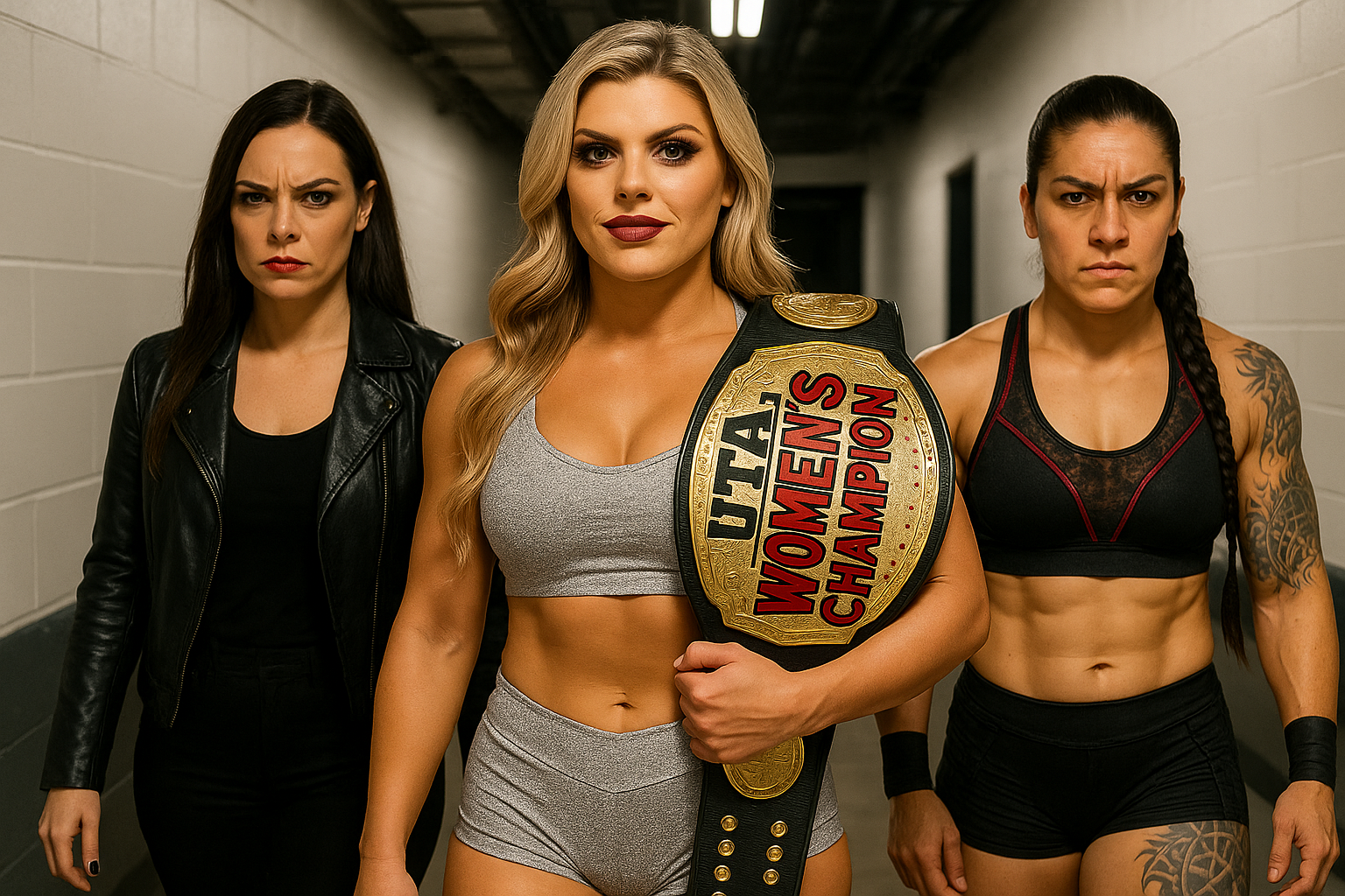 John Phillips: "Here we go, folks. Main event time. The brand new UTA Women’s Champion Amy Harrison, flanked by Rosa Delgado and Selena Vex, and you can already see the strategy forming."