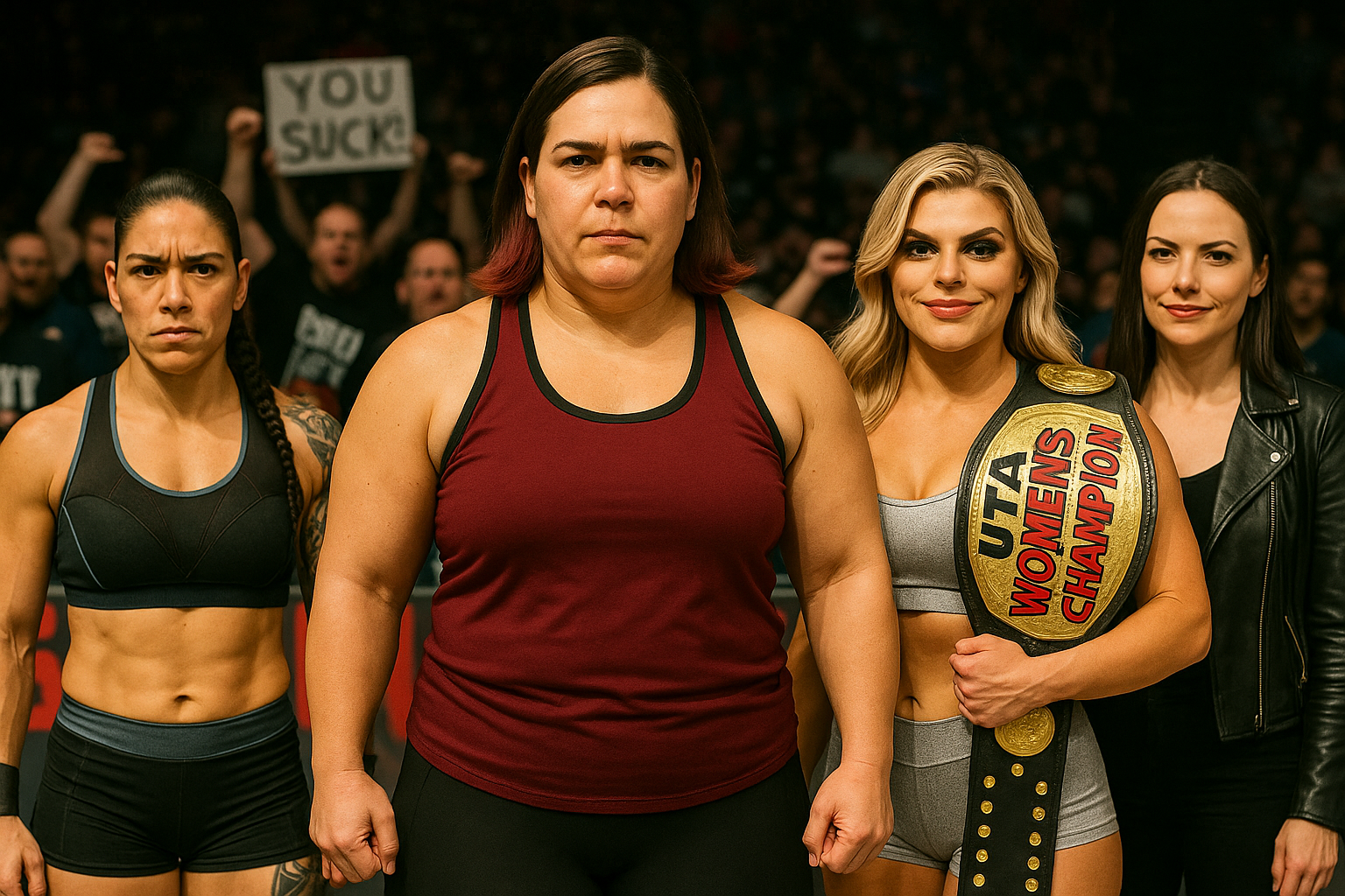 The pounding opening riff of “Sanctify Me” by In This Moment rattles the Liacouras Center, and instantly the boos rain down. A blood-red spotlight hits the stage as Amy Harrison strides through the curtain, flanked by Rosa Delgado and Selena Vex. Amy has the UTA Women’s Championship draped over her shoulder, twirling it as if it’s nothing more than an accessory. Rosa walks with quiet menace, rolling her shoulders and tapping at her left elbow pad, while Selena struts with a smirk, tossing her hair and mouthing insults at the crowd.