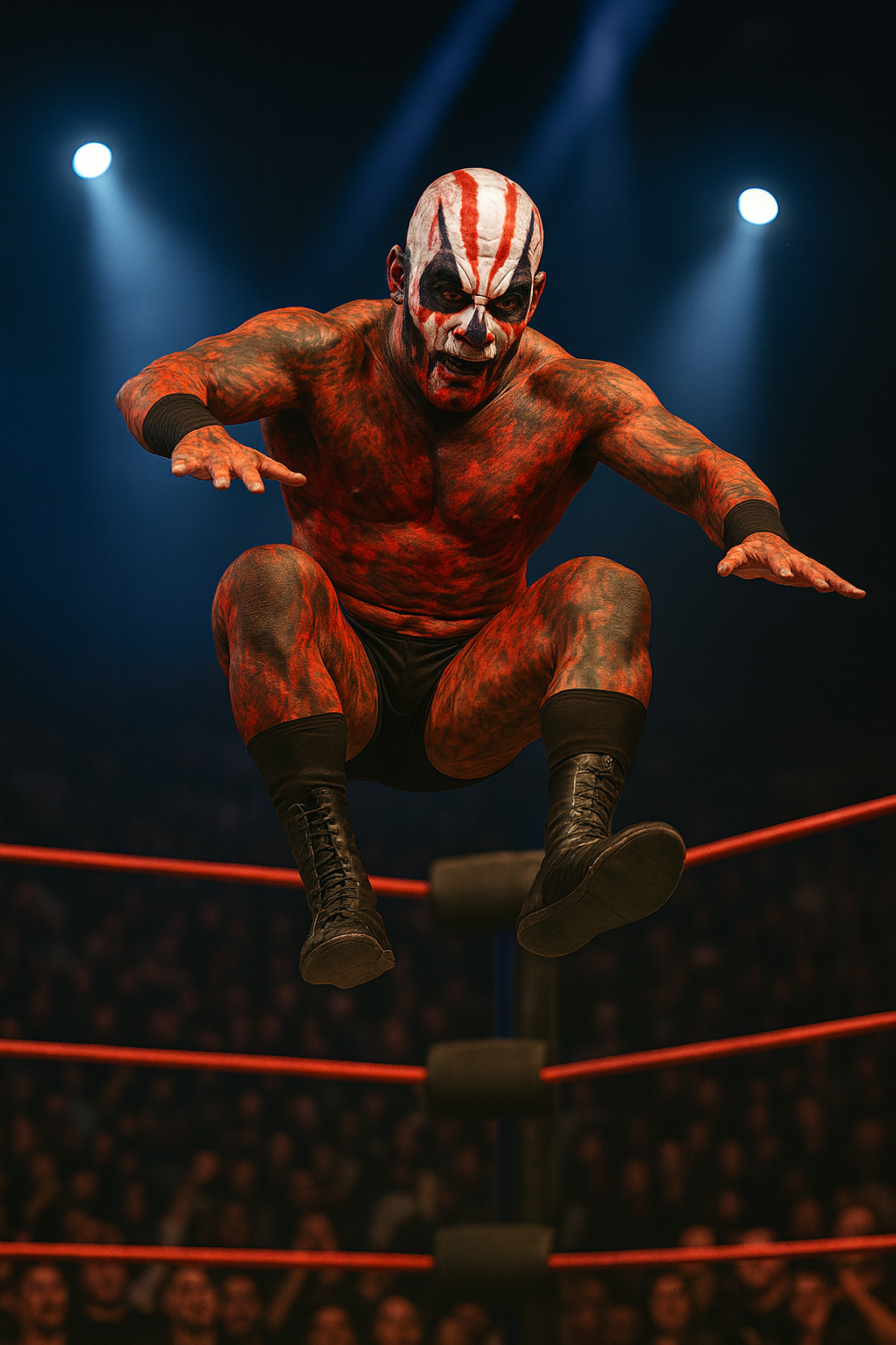 Ross is on his hands and knees, dazed, blood dripping from his temple, trying to shake it off. The referee screams at Maxx, but Mayhem just grins, his eyes wide with manic delight. Suddenly, he bounces off the ropes—