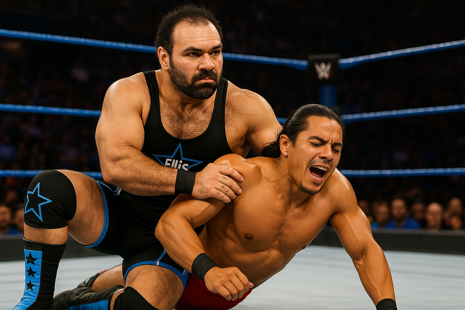 Wolfe doesn’t flinch. He kneels beside Jet, smirking coldly as he slaps on a grounded wristlock and starts driving knees into the trapped elbow. The ref checks Jet—he won’t quit. The crowd rallies behind him, clapping rhythmically.