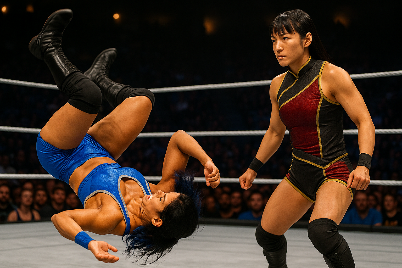 The two circle cautiously. Jet bounces lightly, keeping his feet moving. Wolfe stands more rigid, but his eyes track like a hawk. They lock up—but Jet ducks under immediately and hits the ropes, rebounding with a rolling savate kick!