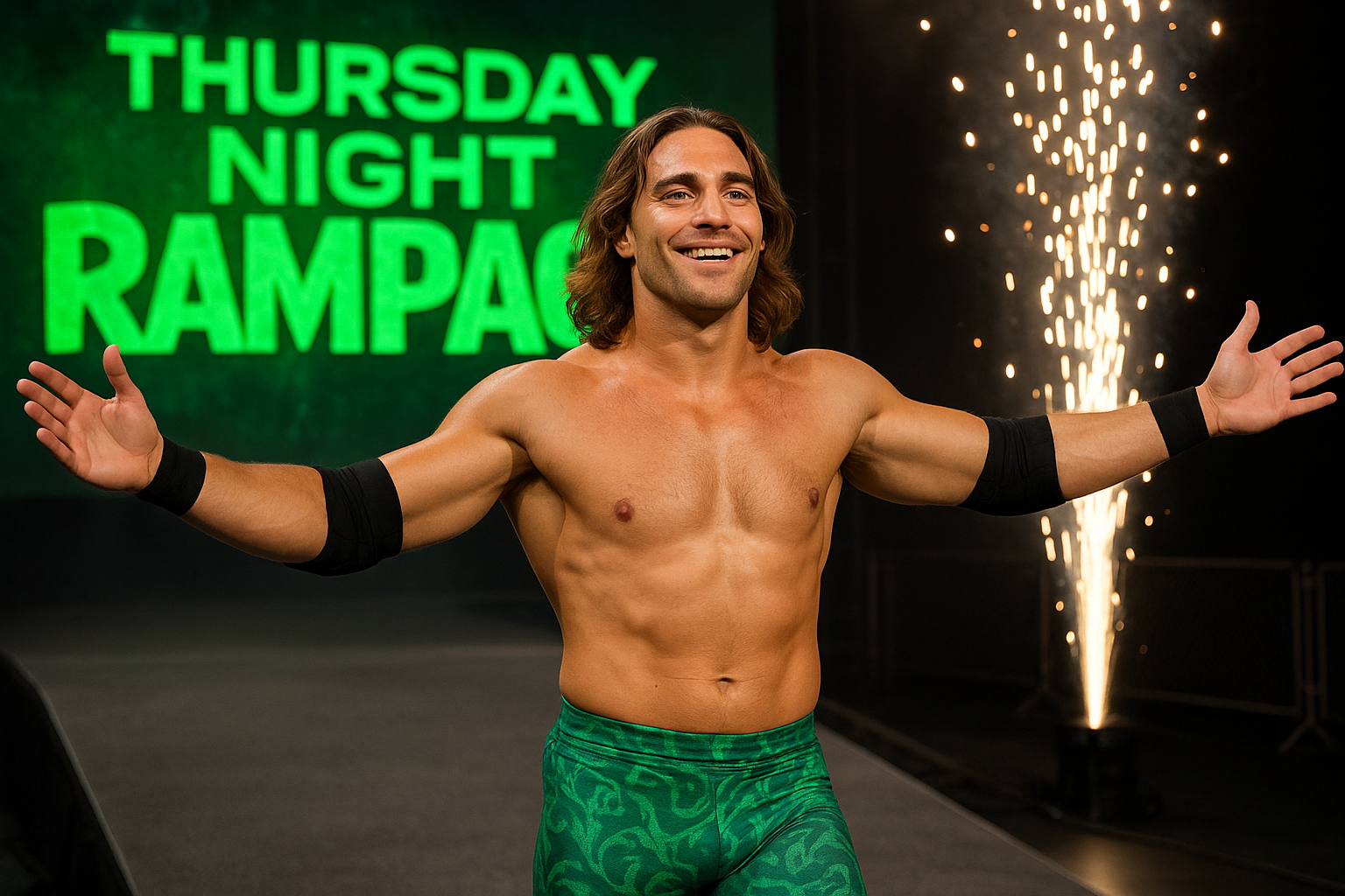 The screen fades to black. The sound of a roaring crowd swells in the background—then, with a thunderous *BOOM*, giant green pyrotechnics explode across the stage. Lights blaze back on, revealing the set of *Thursday Night Rampage* in all its glory. A second later, the intro video begins to play, synced to the show’s new theme song, “This Town” by Human Waste Project featuring Jonathan Davis.